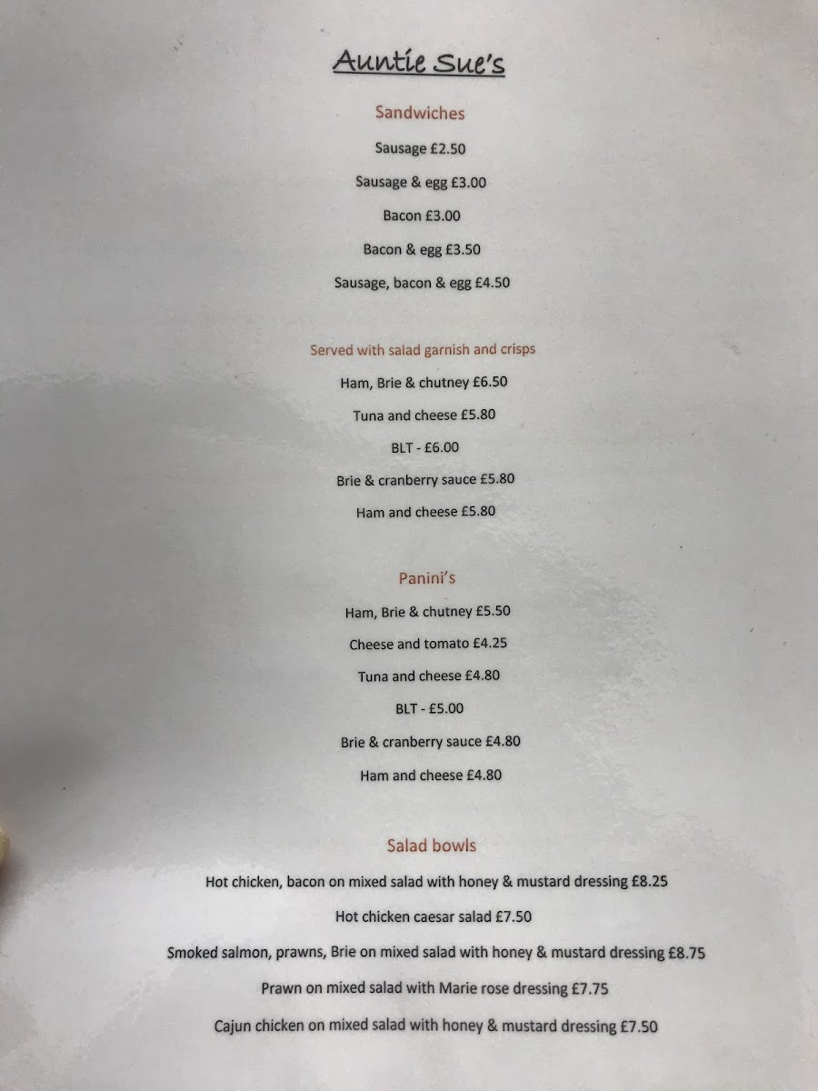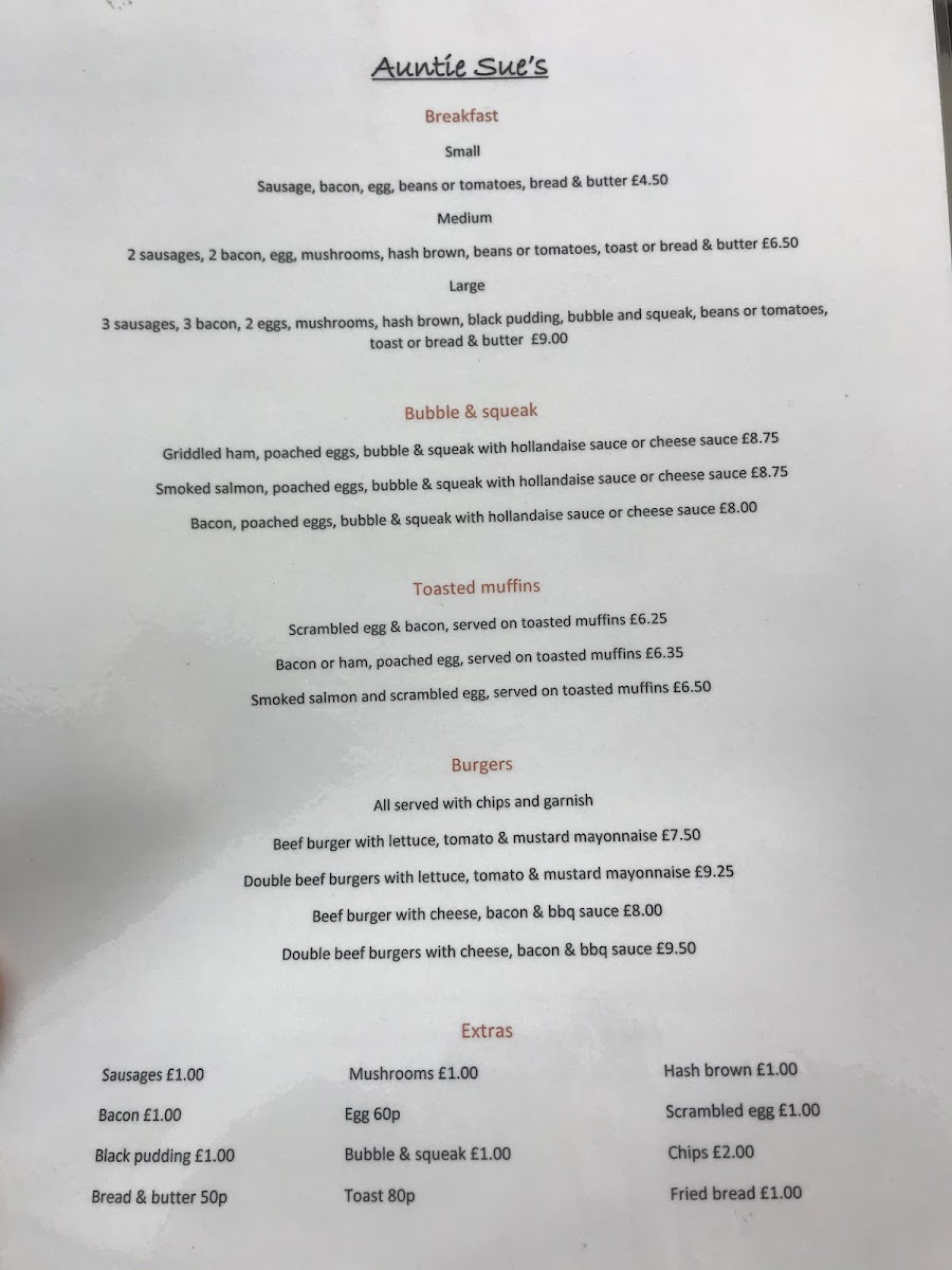Auntie Sue's Cafe offers a hearty and diverse menu, perfect for any time of day. Their Burgers include a variety of options like the Beef Burger with Lettuce, Tomato & Mustard Mayonnaise, alongside other filling choices such as Sausages, Bacon, and Black Pudding Bread & Butter. For breakfast, the classic combination of Sausage, Bacon, Egg, Beans or Tomatoes, and Bread & Butter is available, providing a satisfying start to the day. The Bubble & Squeak options are a highlight, with choices like Griddled Ham, Smoked Salmon, and Bacon, all served with your choice of Hollandaise Sauce or Cheese Sauce. For something lighter, the Toasted Muffins come topped with delicious fillings such as Scrambled Egg & Bacon, Bacon or Ham with Poached Egg, and Smoked Salmon with Scrambled Egg. If you're looking for extras, there are plenty to choose from, including Mushrooms, Eggs, Hash Browns, and Bubble & Squeak. For a satisfying snack, the cafe offers a variety of Sandwiches and Paninis, including options like Sausage & Egg, Bacon & Egg, Ham, Brie & Chutney, and Tuna & Cheese BLT. Their Salad Bowls cater to lighter tastes, featuring options like the Hot Chicken Caesar Salad or Smoked Salmon, Prawns, and Brie on Mixed Salad with Honey & Mustard Dressing. Finally, for those with a hearty appetite, their Others section offers a satisfying plate of 3 Sausages, 3 Bacon, 2 Eggs, Mushrooms, Hash Browns, Black Pudding, Bubble and Squeak, Beans or Tomatoes, and Toast or Bread & Butter. With a wide range of comforting and filling dishes, Auntie Sue's Cafe delivers an inviting menu that caters to all tastes.